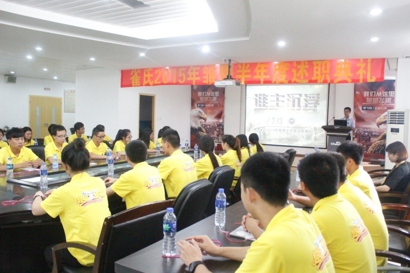 盛夏七月,是一個驕陽似火、絢麗多彩、熱情奔放的季節(jié),2015年7月13日,由雀氏培訓學院與雀氏銷售中心共同舉辦的“‘鷹擊長空?壯志凌云’暨雛鷹半年度述職報告”在惠安總部隆重召開。公司高層一直以來對雛鷹的成長非常重視,銷售中心副總監(jiān)張軍先生、綜合管理中心副總監(jiān)王然女士、培訓學院院長李奕先生、銷售中心管理部主管張冰冰女士等公司領導出席了本次會議。