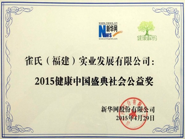 2015年,雀氏榮獲中國老年保健協(xié)會(huì)理事單位、中國老年保健協(xié)會(huì)成立二十周年突出貢獻(xiàn)獎(jiǎng)。