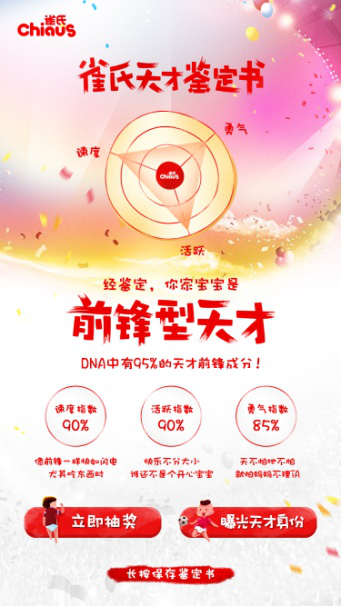 乘著世界杯的東風,“雀氏天才研究院”H5測試也在微信刷屏,被視覺志、媽媽手冊等千萬量級的KOL大號傾力推薦,在奶爸寶媽群體掀起關(guān)注熱潮,大家紛紛討論寶寶的測試結(jié)果。如果你也想為寶寶做個天才測試,可以關(guān)注微信公眾號“雀氏Chiaus”進行測試。