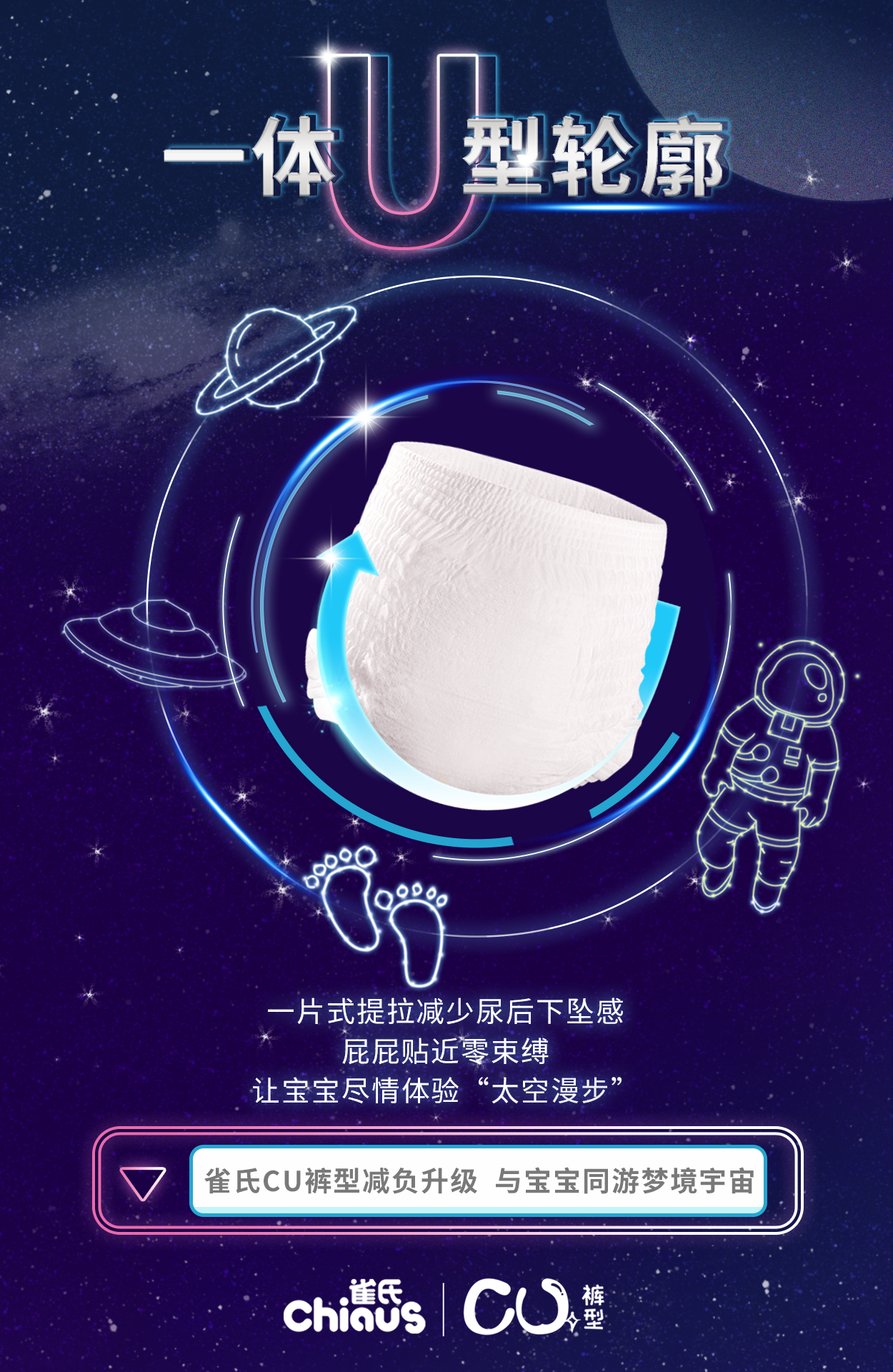 簡言之,C型裁剪 + U型輪廓,組合起來便是“雀氏CU褲型”——升級(jí)后的褲型命名,不僅方便消費(fèi)者記憶,更完美詮釋出其獨(dú)特的銷售主張。其三大設(shè)計(jì)亮點(diǎn),每一項(xiàng)都在為寶寶舒適生活加Buff,讓寶寶在其人生首次探索世界的過程中,能隨心而動(dòng),免受“屁事”干擾。