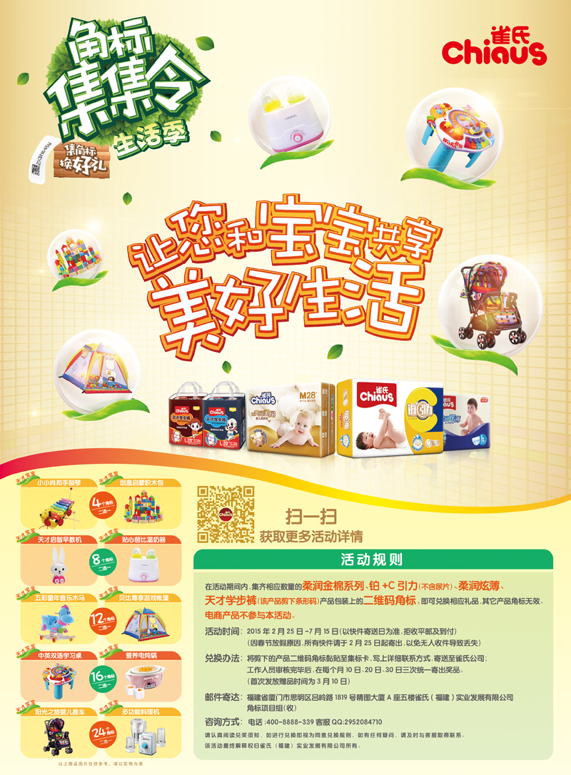 雀氏作為嬰童行業(yè)知名品牌,始終為天才寶寶們的成長助力。2015年,雀氏隆重推出角標(biāo)集集令生活季,為您和寶寶精選眾多精美禮品:益智積木、音樂木馬等童年玩具,故事機(jī)、英紛學(xué)習(xí)桌等早教好助手,手推車、料理機(jī)等育嬰必備利器,讓您和寶寶在不同場合都能享受雀氏為您帶來的美好生活品質(zhì)。
